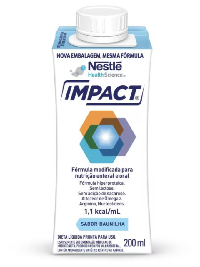 Impact Nestlé é uma fórmula líquida completa e pronta para uso, desenvolvida com nutrientes selecionados para auxiliar no suporte nutricional de pacientes em recuperação. Contém ingredientes balanceados que favorecem a manutenção do organismo e podem contribuir para melhores resultados clínicos. Embalagem prática de 200ml, ideal para uso hospitalar ou domiciliar.